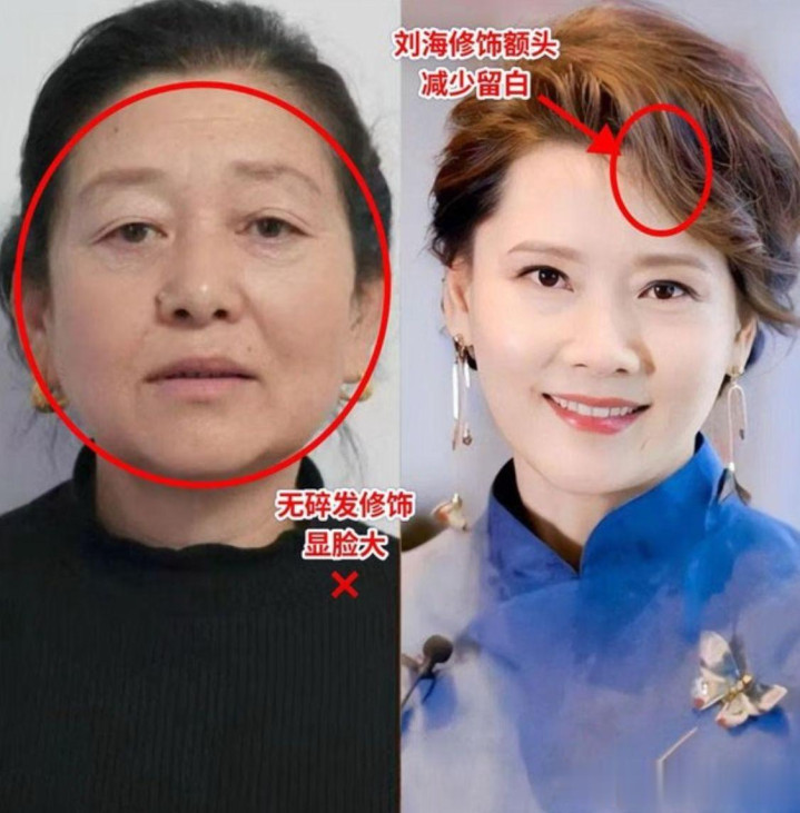 刘海一旦选错了,颜值分就会骤降,比如很厚重的齐刘海,过于个性的狗啃式刘海,都不适合中年女人,换成带点弧度的斜刘海,修饰额头位置,减少留白,更显脸小。